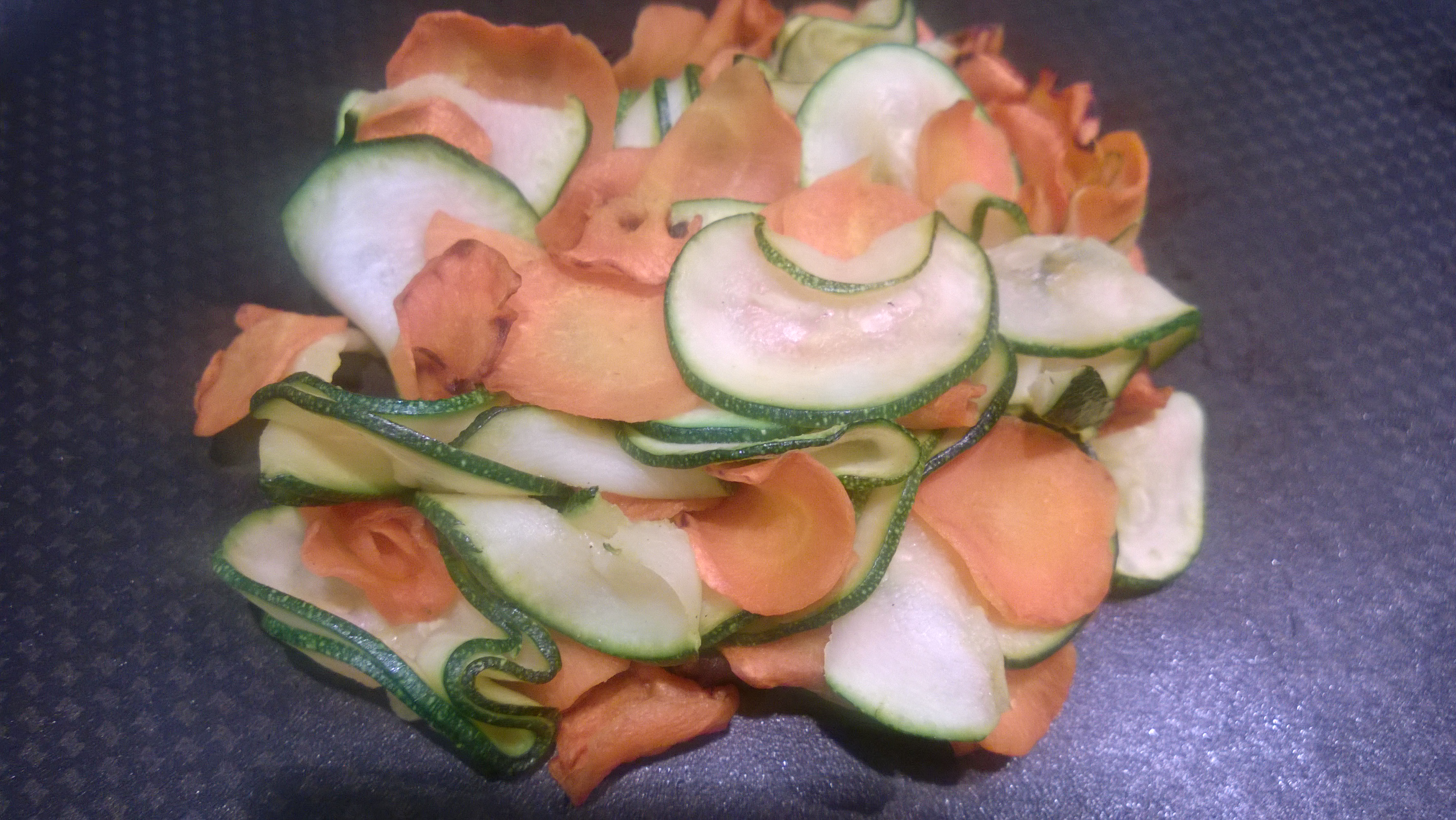 Laver les légumes, éplucher la carotte. Découper en fines rondelles la carotte et la courgette (30 secondes avec le disque râpe à émincer du robot). Les jeter dans la poêle chaude et laisser fondre 10 minutes. Arrosez du jus de citron.